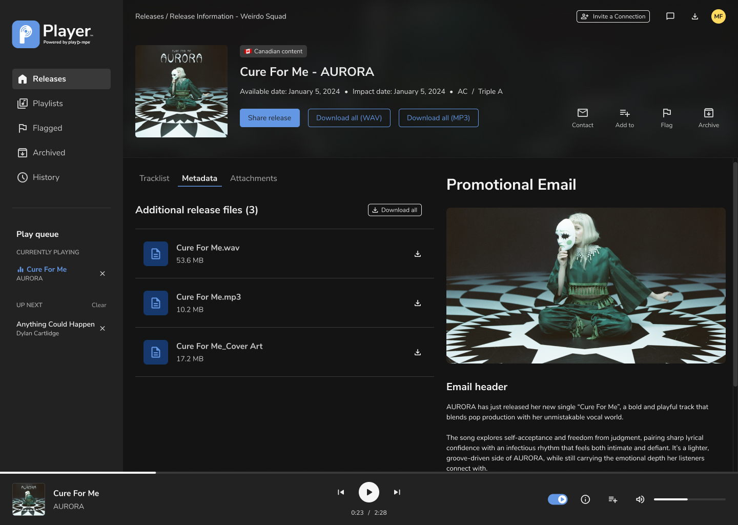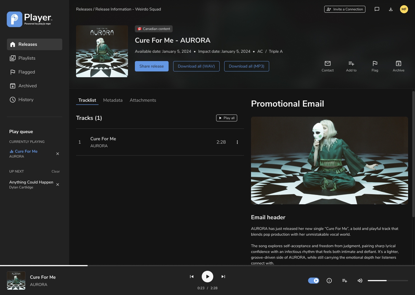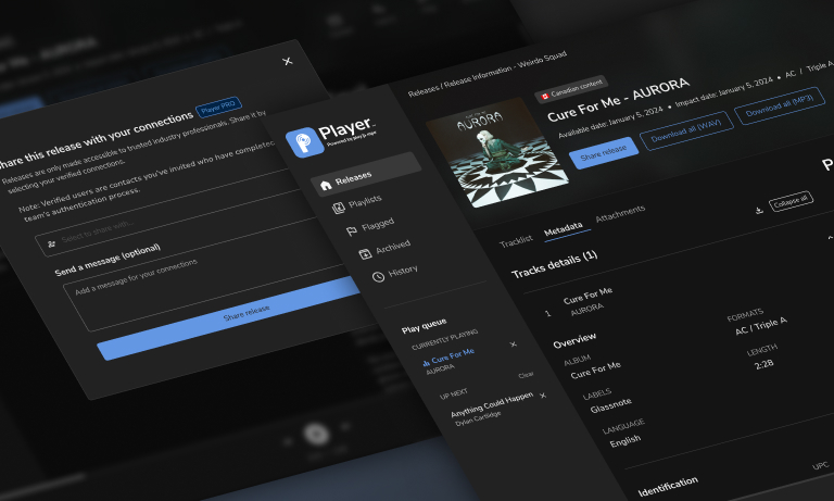Access the latest releases and catalogue content from radio pluggers, record labels and artists – across music markets. Player is accessible 24/7 (even offline) and is mobile-friendly! More than a secure music library, Player has everything you need to do your job. Broadcast-ready song files, metadata, promo photos, bios, press releases, contact information, splits, lyrics and assets that never expire! Flag, queue, stream, create playlists, and download only the files you want. See what’s popular with other curators and discover music by genre, format, market, song version and release type. Contact release reps, invite industry contacts to connect and share releases to verified contacts in your network.