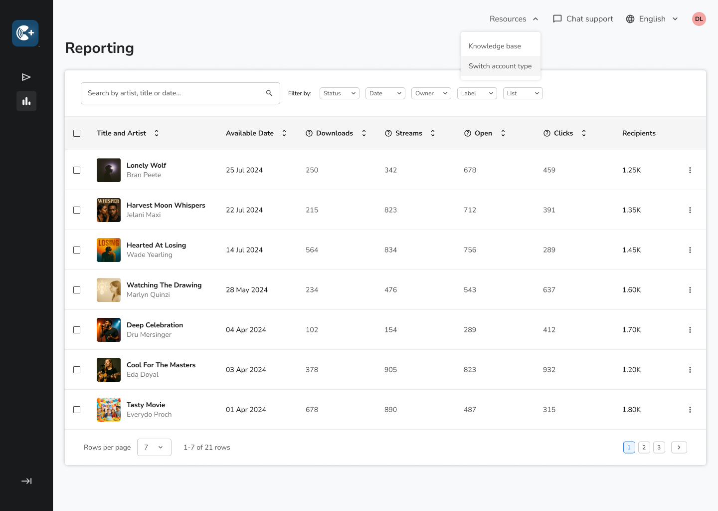Play MPE’s vast (and routinely audited) distribution lists are packed with verified industry contacts. Target music directors, programmers and radio hosts by format, music genre and market. Whether you are promoting one artist, or a full roster spanning genres, Caster has a list for that. View downloads, opens and clicks per release in Reporting and easily export releases to MTR for radio tracking (across North America). Releases are hosted securely in Player.