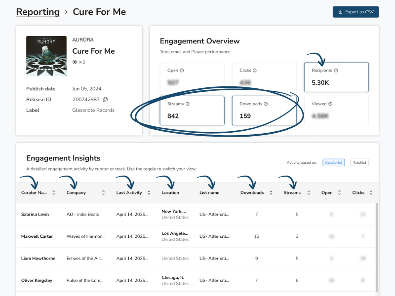 Crea y distribuye promociones que generen impacto y obtén reportes de engagement que realmente importan. Datos que empoderan. Visualiza streams, descargas, aperturas, clics y más.